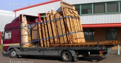 PICTURE: A larger flatbed lorry with the panels stored upright. It normally carries carries 10-12 timber buildings..