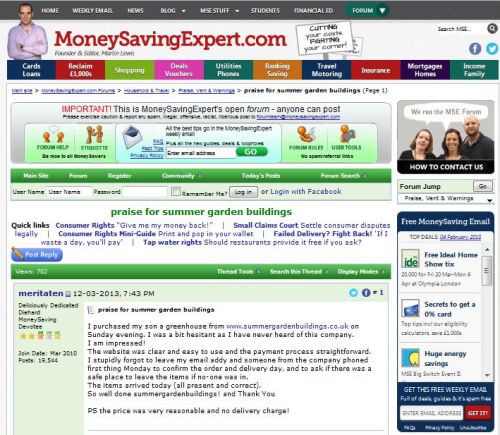 I purchased my son a greenhouse from www.summergardenbuildings.co.uk on Sunday evening. I was a bit hesitant as I have never heard of this company.