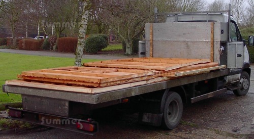 - The picture below shows one of the larger delivery vehicles, with the panels stored upright. It carries 10-12 timber buildings.