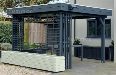 It took my partner and I under a day to construct it, and that is with a couple of modifications that I made. I did not want to drill and screw it to our patio, and therefore got some quite thick decorative, heavy slabs and bolted the uprights to them. I also then drilled to mount brackets so that I could secure it to the wall of the house, we now call it a Pergazebo, because it is a cross between a pergola and a gazebo! Ha ha ha