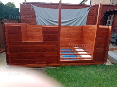 When we received our initial phone call after ordering, the nice man I spoke to did say that you rarely receive updates or photos of completed cabin by customers so we received our order from you a couple of weeks ago and thought you might like to see how 2 disabled OAPs (in our 60's) have got on so far with our Apex 28mm Log Cabin 881 (keep in mind this is Scotland and we do not get the weather very often here to start building outdoors).