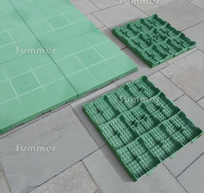 PICTURE: An eco-paving base, viewed from above, with two extra tiles upside down to show the underside.