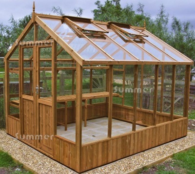 PICTURE: A cedar Victorian greenhouse with cedar base panels and aluminium bar capping.