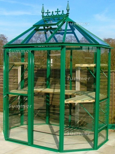 PICTURE: A 6'x8' (1.8m x 2.4m) octagonal aluminium greenhouse with bar capping.
