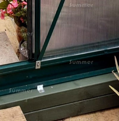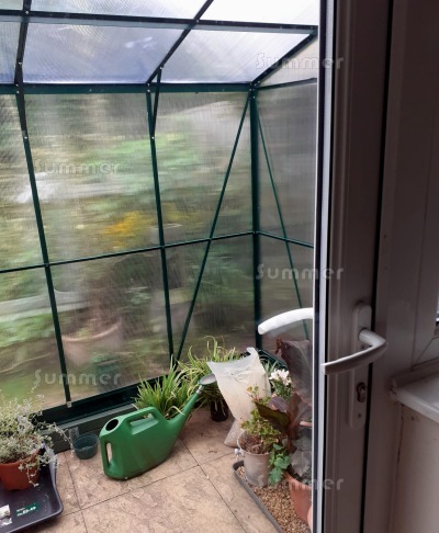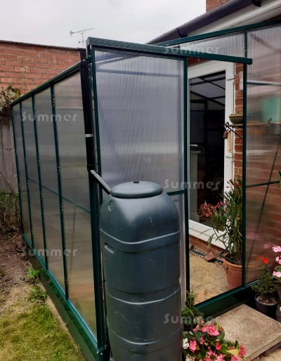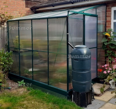 This 6'x8' lean to greenhouse features twin wall polycarbonate safety glazing and aluminium frames in a powder coated green finish. The sliding door is in the 6'2" wide wall and can be fitted in either end. The prices include a free base plinth which makes installation easier. One free roof vent and a side vent in the rear wall provide ventilation. Features include a generous 5'8" eaves height and yet a low ridge height to suit most bungalows. The rear height is 7'5" with the base plinth and just 7'1" without it. This is lower than most other lean to greenhouses so it can be fitted at more sites. Detailed fitting instructions are supplied for DIY self assembly. This lean to greenhouse and all accessories are always in stock, so whatever you order we can deliver within a matter of days.