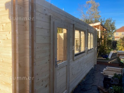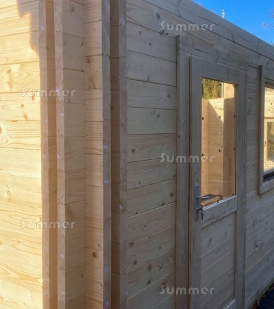 NATURAL WOOD: First, high grade timber is dried in kilns until it reaches the optimum moisture content, then it is planed smooth and machined into tongued and grooved logs and boards. Next the logs are precisely machined at the ends to ensure a precise fit. Finally, each cabin is carefully packed and wrapped. When you unwrap it the wood is untreated. We recommend treating it only after the cabin has been successfully installed and ideally within a week or two. Treating the logs before fitting may cause the wood to swell up and the logs may not fit together correctly. If you are fitting your cabin in a restricted space where future access will be difficult you can stain the logs during installation by reaching down a few logs at a time as you fit them.
